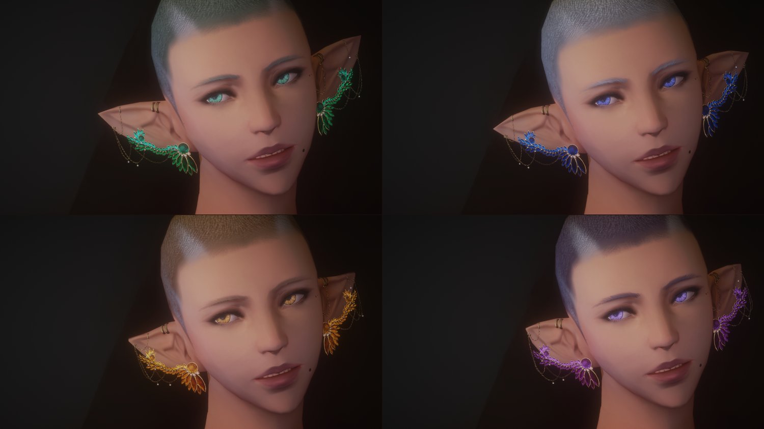 This is a reimagining of an old set of earrings I made. I redid all of my gem methods and textures so I hope you like them! These are fit to all Elezen ears, with four specific variants for the different ear shapes. Due to how Elezen ears are weighted, size 0 ears scrunch the earrings up a bit towards the tips of the ears - you can see what it looks like on image 3 with the ruby colorset. The earrings should line up with similar sculpt ears, at least mostly! Everything is colorset, so you can edit it to your liking!